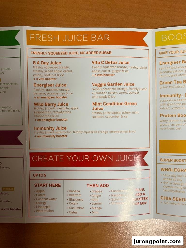 Boost Juice's Jurong Point location offers fresh, made-to-order beverages that support healthy lifestyle choices for western Singapore residents. Their commitment to using real fruit, natural ingredients, and providing nutritional transparency makes them the preferred destination for health-conscious consumers seeking convenient, delicious alternatives to traditional beverages while shopping at Jurong Point.